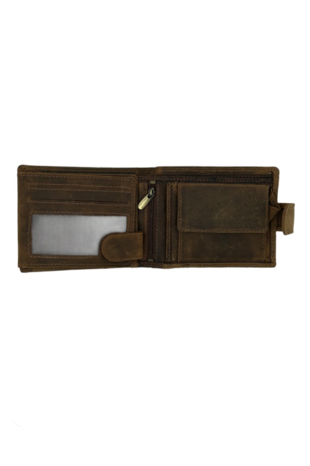 Peněženka se zapínáním na přezku se cvokem je vyrobená z broušené hovězí kůže, která Vám zajistí větší odolnost a delší výdrž než ostatní materiály. Peněženka je dvakrát prošitá. Po otevření je v přední části přístupný mincovník s klopou na cvok a prostor na uložení karet a dokladů s vnitřní přezkou a cvokem.  Za nimi jsou dvě kapsy na bankovky.