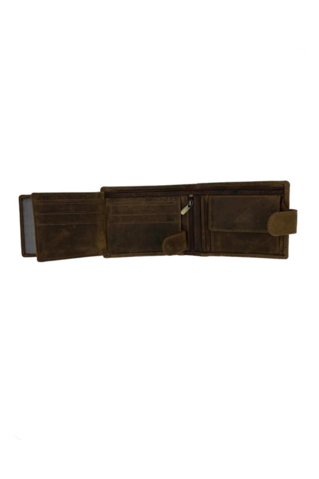 Peněženka se zapínáním na přezku se cvokem je vyrobená z broušené hovězí kůže, která Vám zajistí větší odolnost a delší výdrž než ostatní materiály. Peněženka je dvakrát prošitá. Po otevření je v přední části přístupný mincovník s klopou na cvok a prostor na uložení karet a dokladů s vnitřní přezkou a cvokem.  Za nimi jsou dvě kapsy na bankovky.